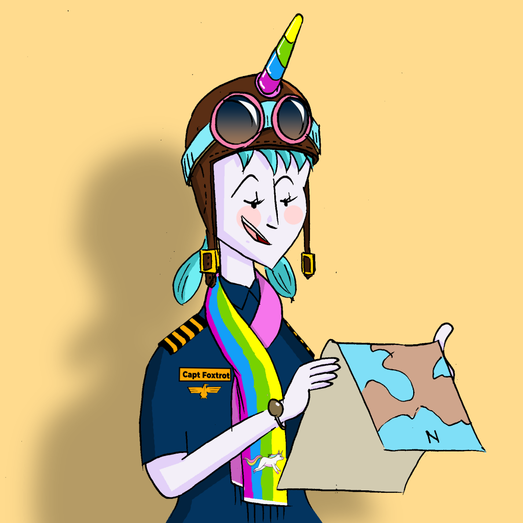 Captain Foxtrot’s face and story have been released but she is not available for purchase. She will be given as a surprise gift to a lucky buyer of another randomly chosen Captain. Foxtrot has always fixated on her map, will she find her way to your MetaMask wallet? Buy a CryptoPilot to find out!